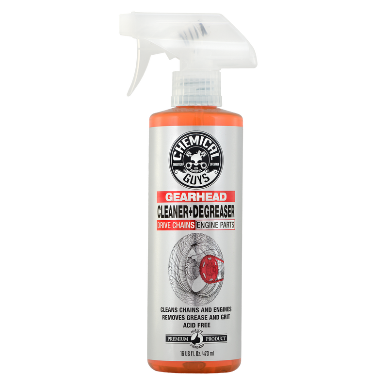 Gearhead is tough on grease, oil, grit, and grime. Simply spray Gearhead directly into motorcycle drive chains and onto gear sprockets to break down and remove stuck filth and abrasive grit that damage and wear chains over time. For intense stuck-on contamination, agitate filth with a stiff chain brush and purge any loosened debris with another spray of Gearhead Cleaner.