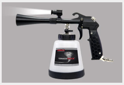 Tornador® has completely changed the professional detailing industry with the new the TornadorMax®! You will see all the benefits of the Z-020 Tornador® Black with newly engineered and upgraded features. The rotate set is now equipped with a patented spring technology, which increases the torque and intensifies the cleaning power. Thanks to the spring technology the cleaning time is reduced and efficiency is greatly increased. The newly designed ergonomic handle and trigger of the TornadorMax® provides users more control and comfort. This progressive design allows for individual customization through easily replaceable color handles and trigger grips. The TornadorMax® also has a built-in air regulator allowing for precise control of the air pressure along with adding a swivel air inlet for flexibility. An Anti-Slip mat on the jar will allow the TornadorMax® to stand flat even when connected to an air hose which results in minimized spills and falls. Finally, the TornadorMax® comes with a LED tactical light to illuminate dark areas without having to incorporate bulky lights. The TornadorMax® is the newest in the family of must have detailing tools!